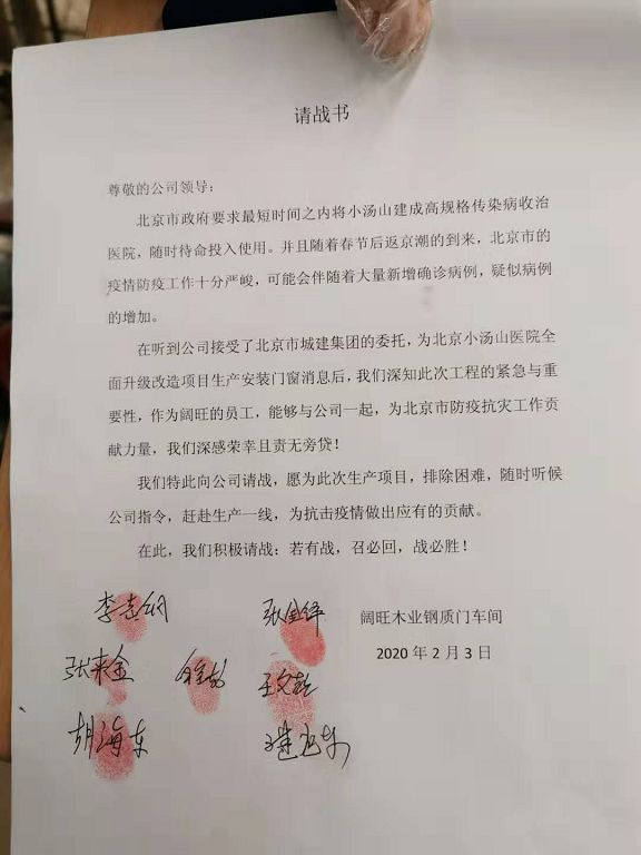 面對著嚴峻的疫情防控工作,闊旺門業(yè)作為一家門窗生產(chǎn)企業(yè),勇于肩負起社會責(zé)任,有條不紊的配合著一道道緊急指令的進行。闊旺員工積極請戰(zhàn):若有戰(zhàn),召必回,戰(zhàn)必勝!努力排除困難,趕赴生產(chǎn)一線,加班加點,日以繼夜,提前完工,為疫情防控工作的順利開展做出了貢獻。